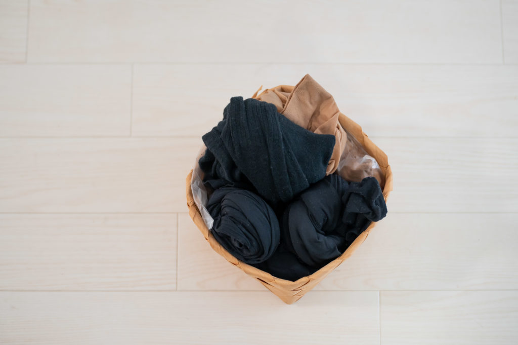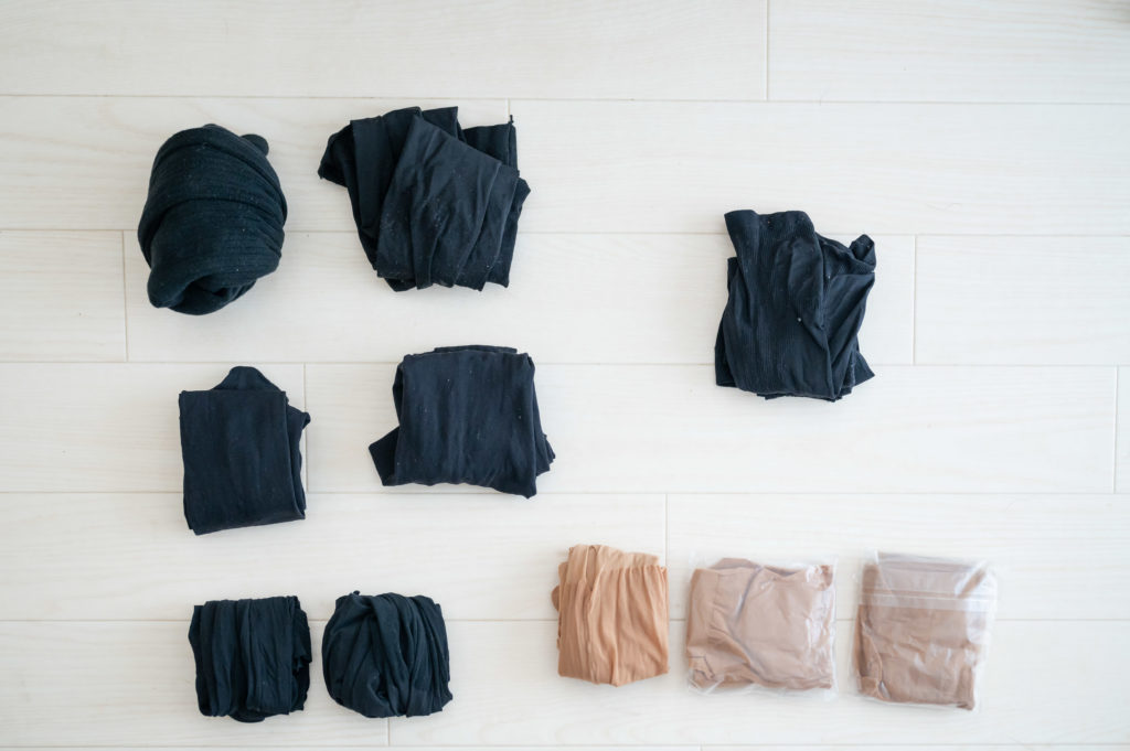 こんな風に並べてみると、寒くなったら履くもの黒色タイツと、冠婚葬祭用のストッキング(肌色と黒色)がそれぞれ3〜4足づつあることが把握できました。