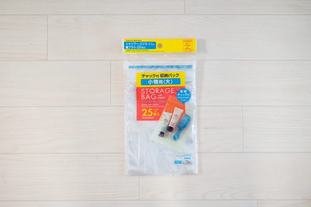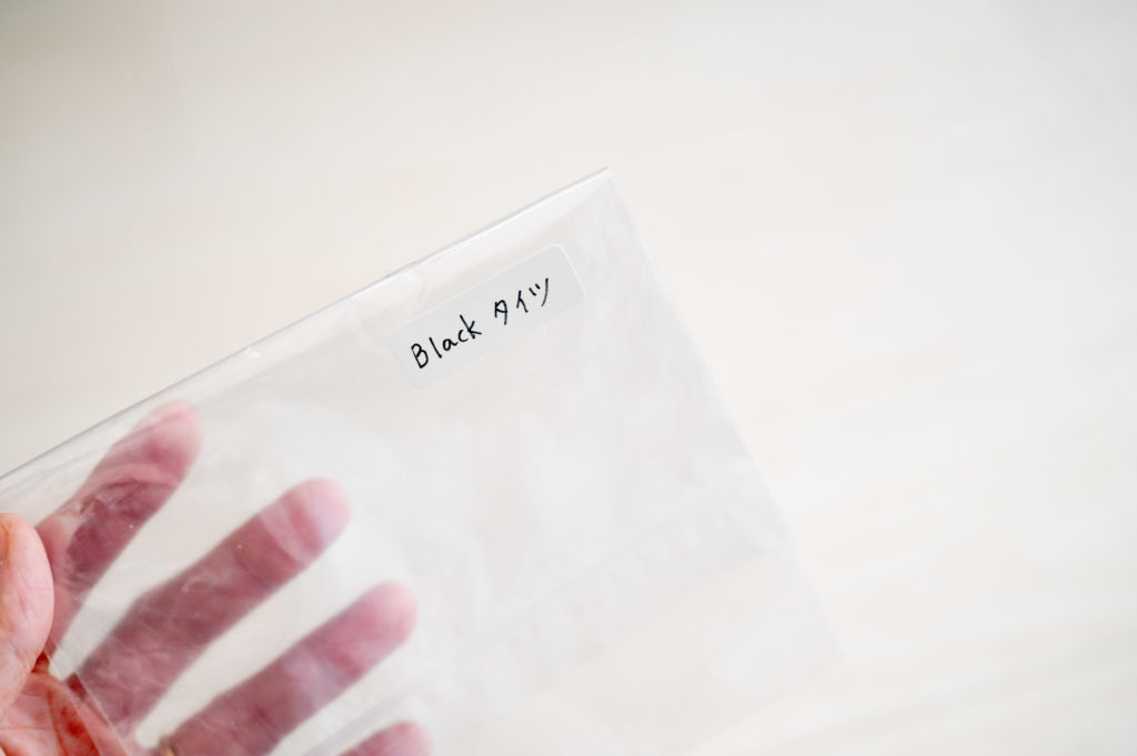 そして、今回は100均一で購入したチャック付き収納バックを収納袋として使用しました。これは圧縮袋にもなるので、タイツ類の収納にはシンデレラフィット!